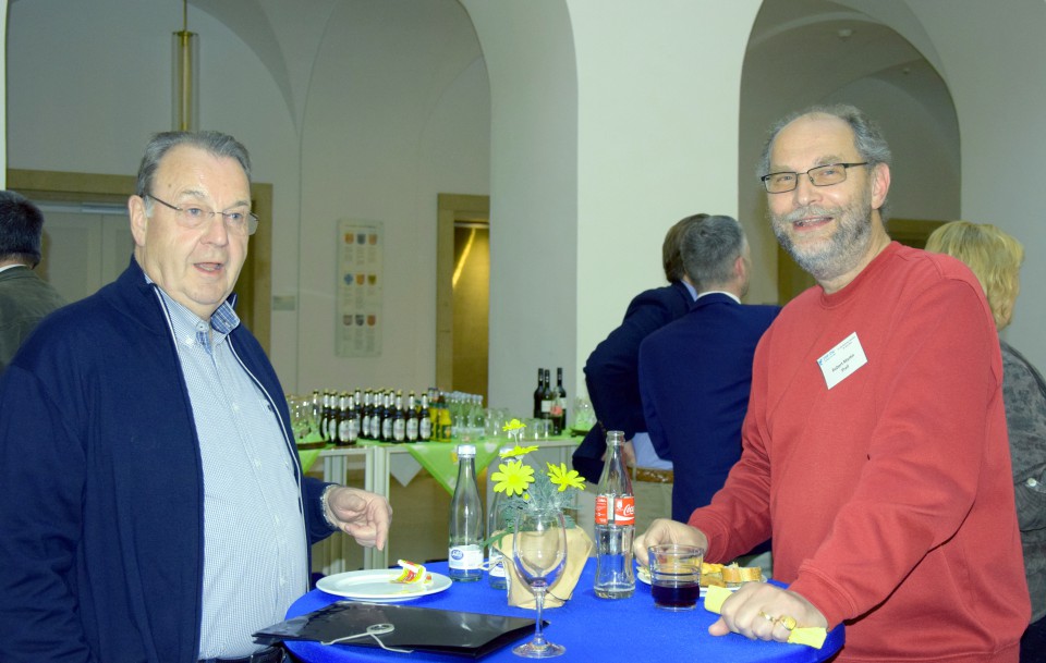 Beim geselligen Imbiss im Innenhof des LWL-Landeshauses nutzen viele Teilnehmer im persönlichen Gespräch noch die Gelegenheit zum Kennenlernen und Erfahrungsaustausch untereinander.
